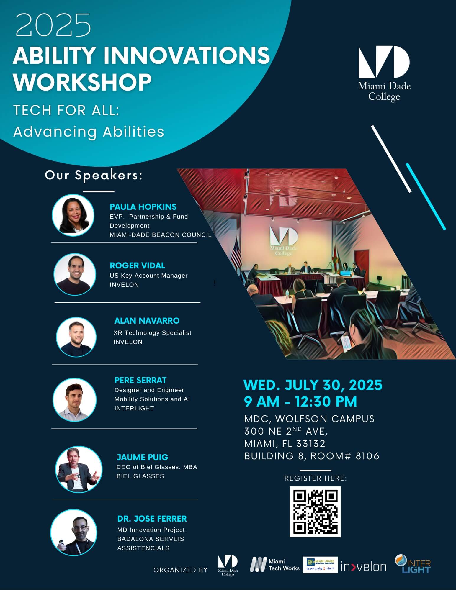 Under the theme “Tech for All: Advancing Abilities,” the workshop will feature international experts in immersive technology, mobility solutions, and digital health. Speakers from INVELON, INTERLIGHT, BIEL GLASSES, and BADALONA SERVEIS ASSISTENCIALS, all of which now have a growing presence in Miami, will share innovations that are transforming how individuals access education, employment, and daily life.