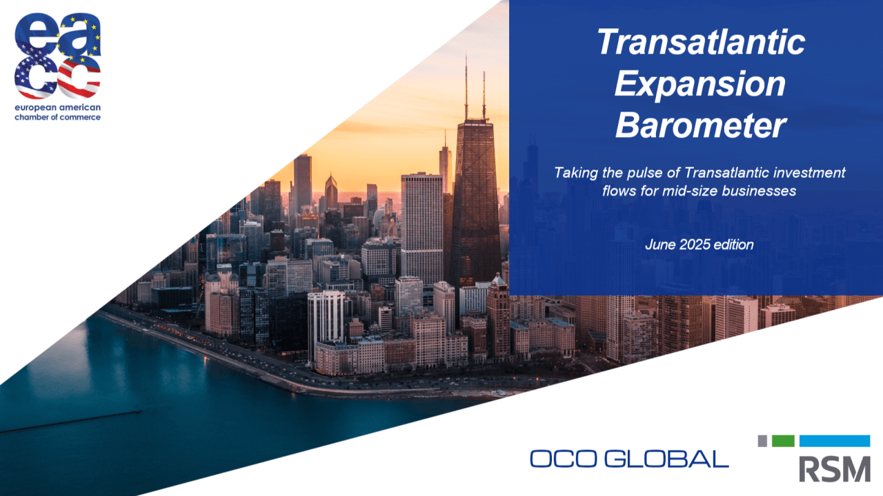 Following the initial launch of the Transatlantic Expansion Barometer in November 2024, the EACC Network, RSM, and OCO Global are pleased to invite you to an exclusive webinar presenting the 2025 results — and offering a timely update on how transatlantic investment trends are evolving amid deep geopolitical and economic shifts.