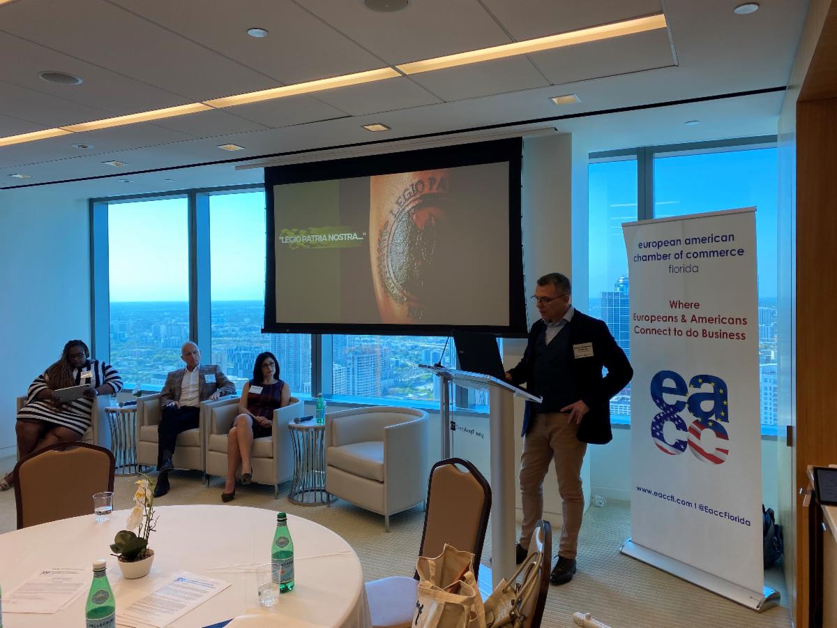 On May 9th, EACC Florida was delighted to welcome Colonel Guillaume de Sercey now retired from the French Foreign Legion, Carol Cabezas, former President of Azamara Cruises and Dr. Victor Lozinski, Co-Founder, CEO & Chairman of the Board of LeverX, for a high-level exchange on corporate leadership. The Conversation was moderated by Ashlee M. Wright, a founder, CEO and leader in the education sector. The event was hosted by President's Circle Member Greenberg Traurig.