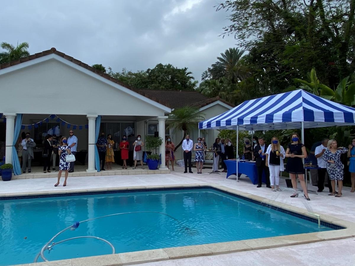 While a deluge was pouring over our Magic City on May 9th, not a drop of rain fell over the Residence de France. A wonderful turn-out of the European consular corps, local authorities, representatives from South Florida’s cultural and academic landscape, and many EACC Florida Members and Friends enjoyed the French and German food and wine offerings, live classical music and – for many – their first post-Pandemic in-person networking opportunity in the lovely gardens of the consular residence.